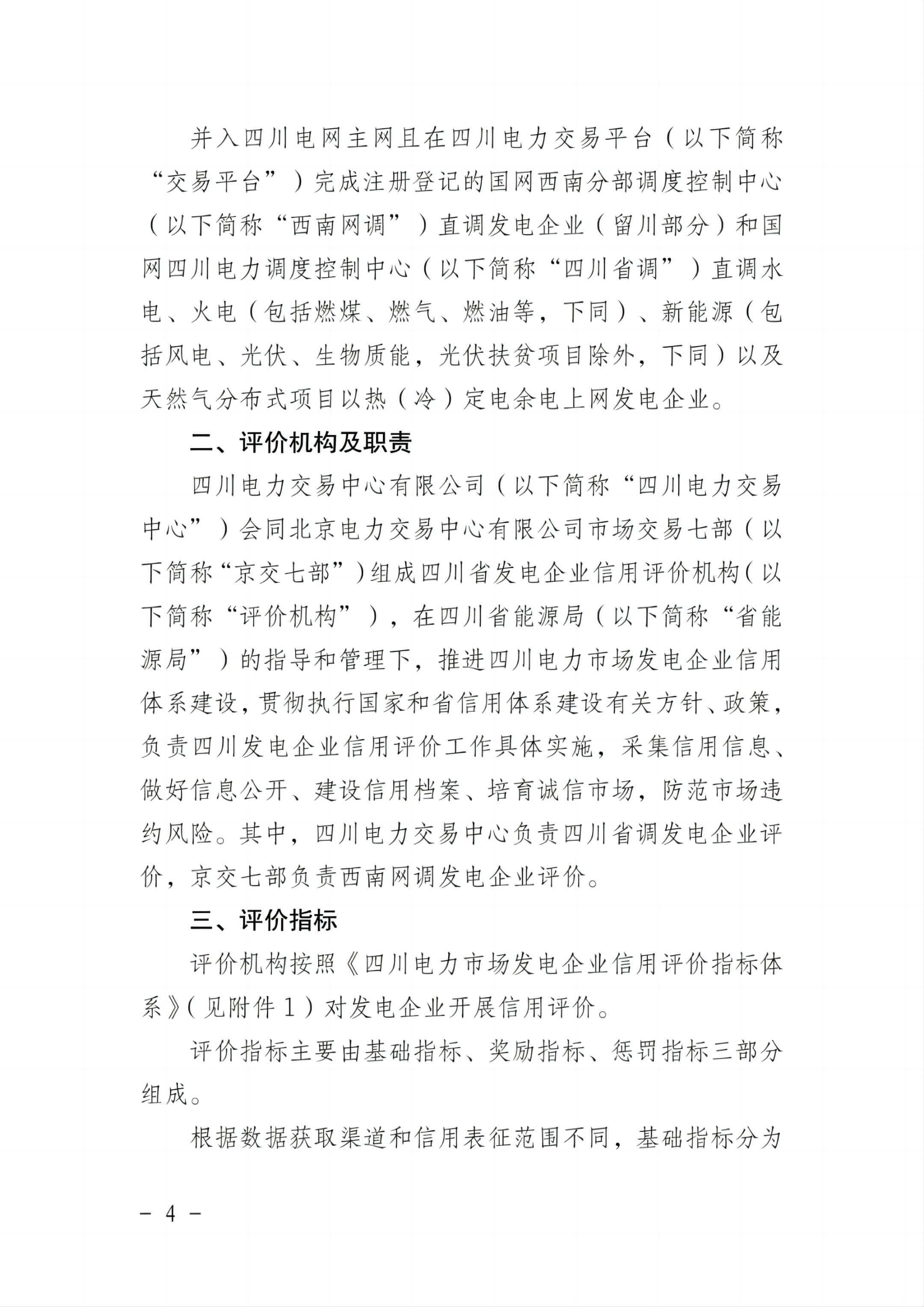 评价范围包括并入四川电网主网且在四川电力交易平台(以下简称“交易平台”)完成注册登记的国网西南分部调度控制中心(以下简称“西南网调”)直调发电企业(留川部分)和国网四川电力调度控制中心(以下简称“四川省调”)直调水电、火电(包括燃煤、燃气、燃油等,下同)、新能源(包括风电、光伏、生物质能,光伏扶贫项目除外,下同)以及天然气分布式项目以热(冷)定电余电上网发电企业。
