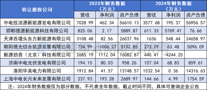 事实上,查询过往信息不难发现,近几年电力央企处置部分项目公司股权的动作一直存在,主要是亏损或者高负债项目公司。如上诉国家电投“甩卖”的项目公司,有多个公布了2023年以及2024年的部分财务数据,均是营收、净利润下滑甚至亏损,亦或高负债。