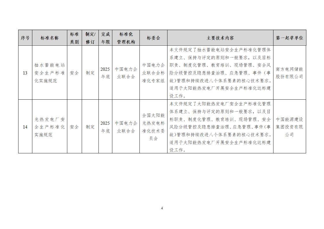 文件包括《电化学储能电站安全预评价规程》,完成年限为2025年底。本标准规定了电化学储能电站安全预评价的具体要求,主要关注电站设计方案和设备技术要求风险。标准适用于电化学储能电站安全预评价工作。