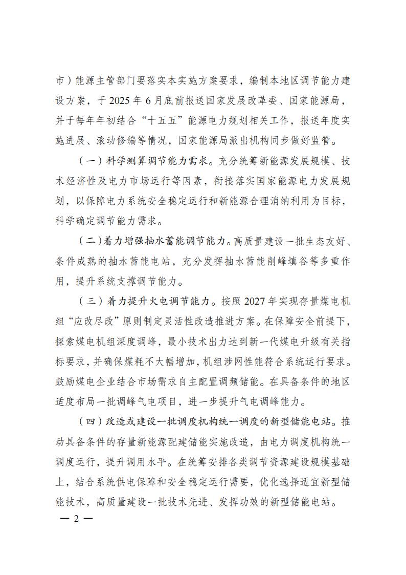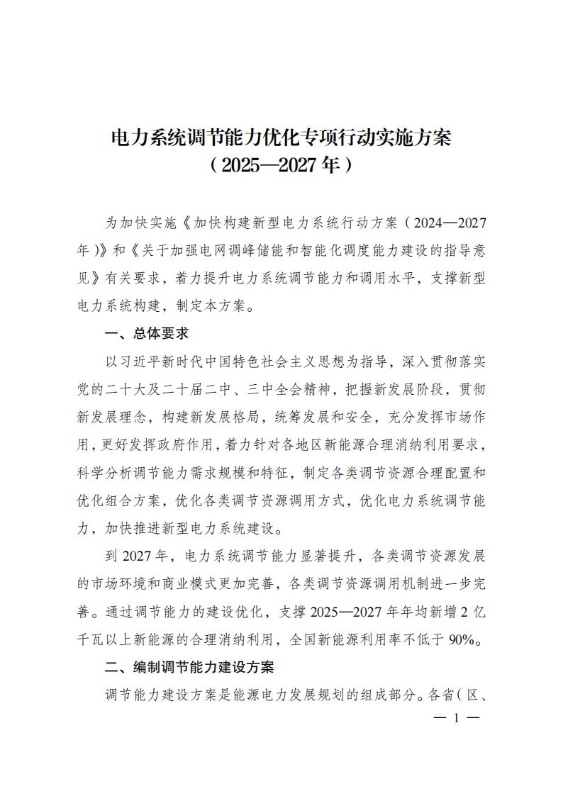 为进一步落实《加快构建新型电力系统行动方案(2024—2027年)》和《关于加强电网调峰储能和智能化调度能力建设的指导意见》,着力提升电力系统调节能力和调用水平,有效支撑新能源消纳利用,国家发展改革委、国家能源局制定了《电力系统调节能力优化专项行动实施方案(2025—2027年)》。现印发给你们,请认真组织落实,因地制宜推进调节能力建设。