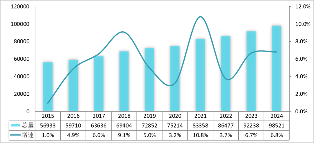 图1 2015—2024年全国全社会用电量及增速情况(单位:亿千瓦时)