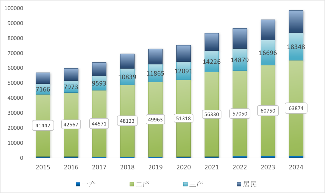 图4 2015—2024年分产业用电量(单位:亿千瓦时)