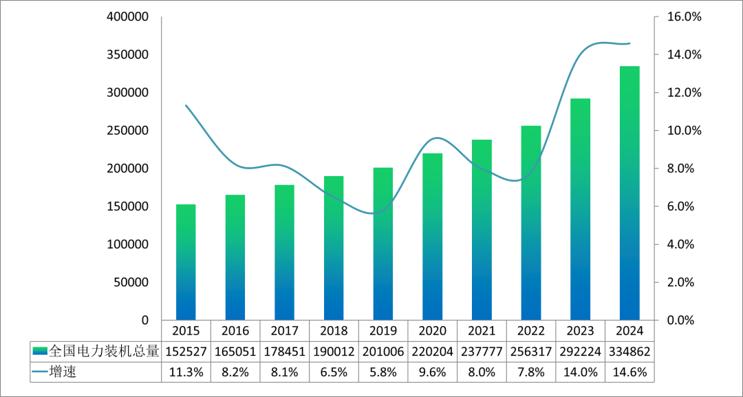 图5 2015—2024年全国电力装机及增速情况(单位:万千瓦)