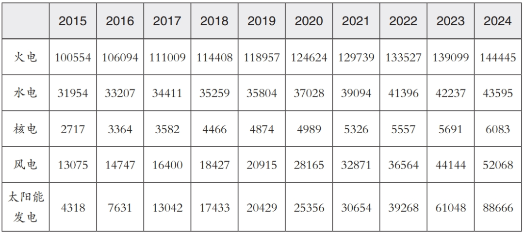 表1 2015—2024年全国电力装机情况(单位:万千瓦)
