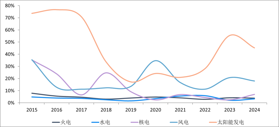 图7 2015—2024年火电、水电、风电、太阳能发电、核电装机增速情况