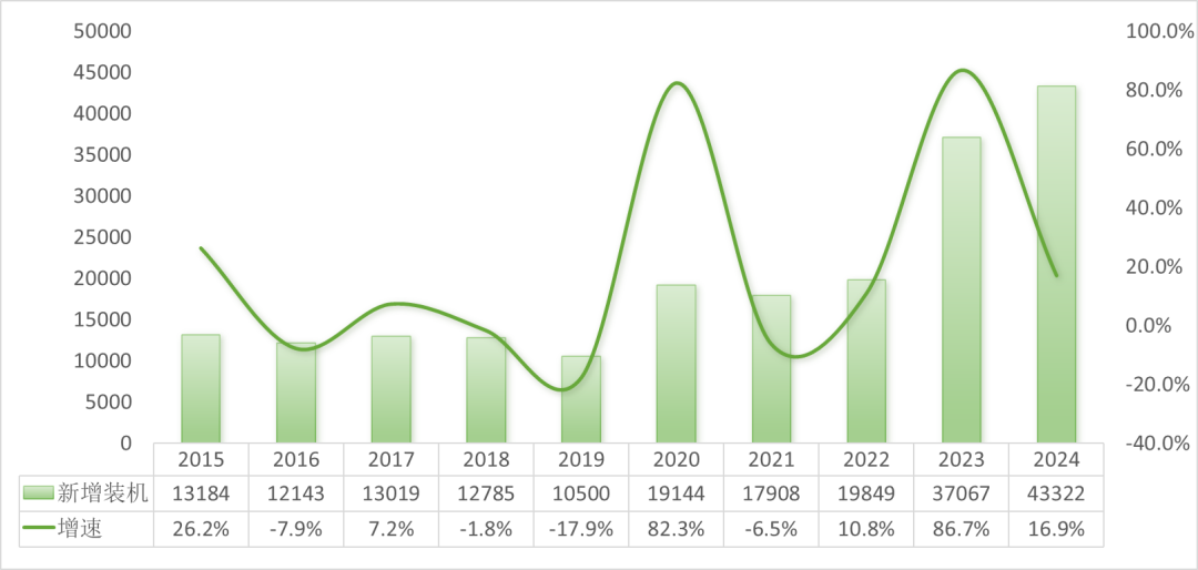 图8 2015—2024年全国新增电力装机及增速情况(单位:万千瓦)