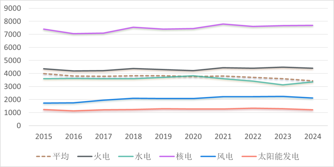 图13 2015—2024年不同电源发电设备利用小时变动情况(单位:小时)