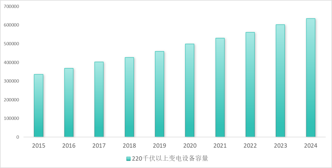 图15 2015—2024年220千伏及以上变电设备容量情况(单位:万千伏安)