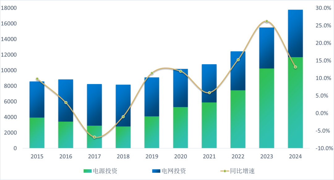 从近十年数据看,电网投资占比在“十三五”中期的2018年达到顶峰65.8%,电网投资接近电源投资2倍。从2019年开始,电网投资占比呈下降趋势,电源投资占比连续升高,并在2020年出现反转。“十四五”期间,电源投资占比持续提升,绝对值差距连续拉大,2024年电源投资较电网多投资5604亿元,绝对差值为近十年最高。
