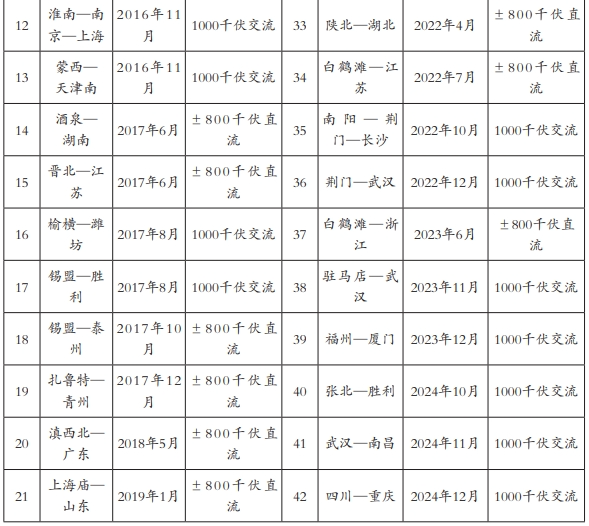 “十四五”以来,我国重大输电通道工程建设稳步推进。截至2024年底,我国共建成投运42项特高压线路。国家电网建成投运22项交流特高压,16项直流特高压;南方电网建成投运4项直流特高压。
