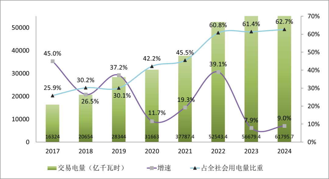 图17 2017—2024年全国市场交易电量、增速及占全社会用电量比重(单位:亿千瓦时)